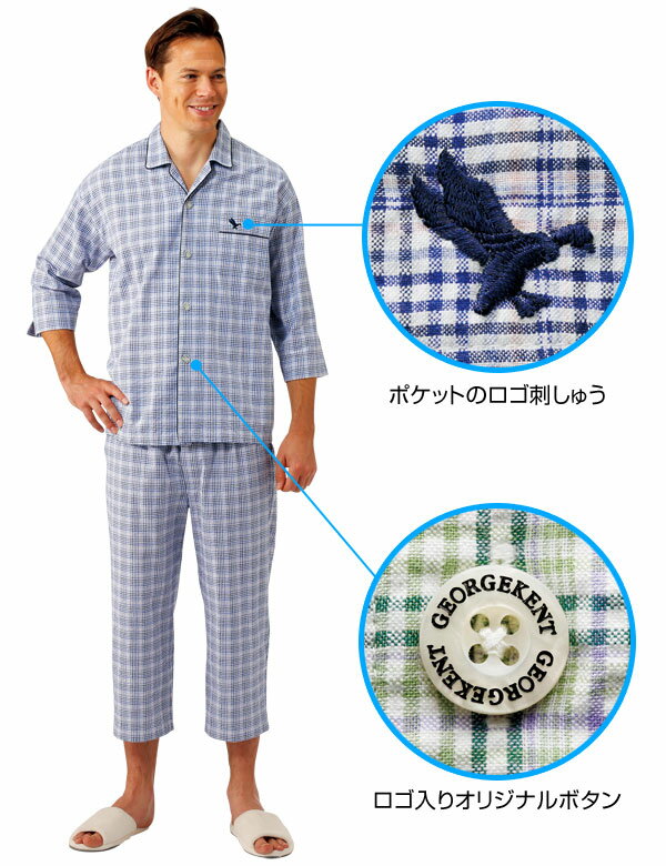素材 綿100% 仕様 上着/左胸ポケット付き パンツ/ウエスト総ゴム(取り替え口付き)・前開き 洗濯 洗濯機可 生産国 カンボジア長すぎず短すぎない、丁度いい8分丈のパジャマ ジョージケント 綿サッカー格子柄8分丈パジャマ 2色組 凹凸のあるサッカー生地使用でベトつかず快適な着心地 寝苦しい夏も半袖パジャマは苦手・・・という方にお薦め。